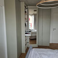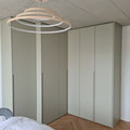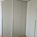 Durch die pastellgrüne Farblackierung fügt sich der Einbauschrank perfekt in das Raumkonzept ein und harmoniert mit dem Fischgrätparkett aus Eiche sowie der Sichtbetondecke. Die Ankleide ist zudem mit zahlreichen Extras ausgestattet - wie etwa bodentiefe Griffprofile, Innenschubladen und ein integrierter Spiegel. Abgerundete Tablare im Eckschrank sorgen für zusätzlichen Bedienkomfort.